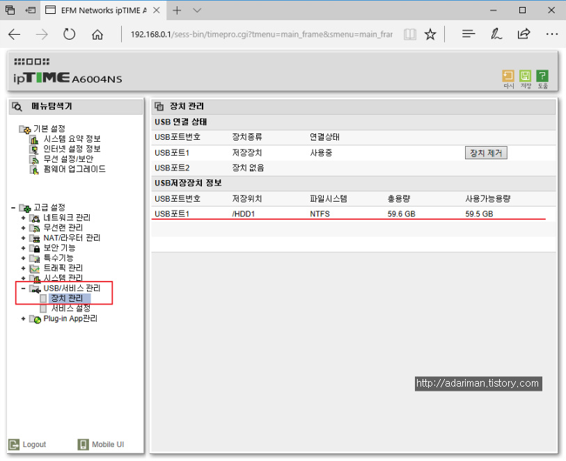 공유기 관리 페이지 192.168.0.1로 들어간 다음 [USB/서비스 관리] → [장치 관리]를 보면 현재 장착되어 있는 장치가 확인됩니다. 저는 USB 메모리를 하나 꽂았는데, 외장하드도 사용이 가능합니다.