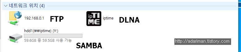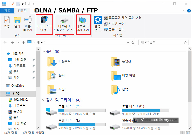 내 PC로 들어가면 상단에 미디어 서버 연결, 네트워크 드라이브 연결, 네트워크 위치 추가 세 종류 버튼이 있는데, 미디어 서버 연결이 DLNA, 네트워크 드라이브 연결이 SAMBA, 네트워크 위치 추가는 FTP 설정이 가능합니다.