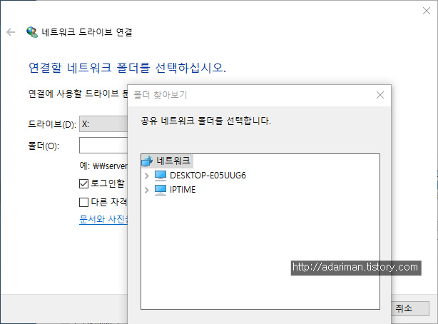 같은 작업 그룹 안에 있다면 IPTIME 이라고 뜨는데 그거 누르고 다음 누르면 됩니다. 추가적으로 아이디와 비밀번호를 물어보니 위에서 설정한 아이디와 비밀번호를 입력하면 됩니다.