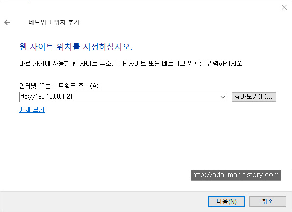 마지막으로 FTP입니다. 네트워크 위치 추가를 눌러 FTP 서버 주소를 입력해줘야 합니다. 공유기의 내부 IP가 192.168.0.1이고 간이 NAS 내부 포트가 21이기 때문에 ftp://192.168.0.1로 입력해주고 다음 누르면 됩니다. 여기서도 아이디와 비밀번호를 물어보니 위에서 설정한 대로 입력하면 됩니다.