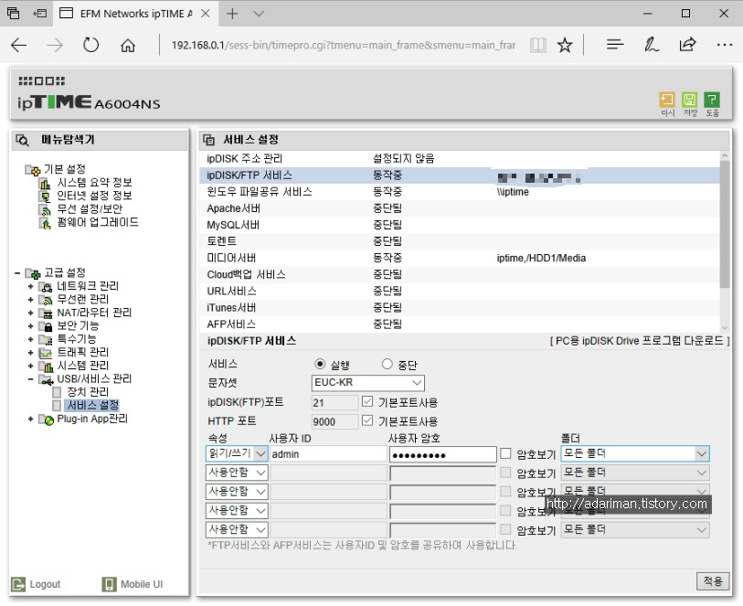 그 다음 [ipDISK/FTP 서비스], [윈도우 파일공유 서비스], [미디어서버]를 클릭한 다음 '실행'으로 놓고 접속 계정으로 사용할 사용자 ID와 암호를 만든 뒤에 폴더 접속 권한을 만들어 줍니다.
