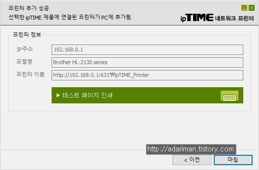 다 됐으면 [ipTIME 네트워크 프린터 프로그램 다운로드] 버튼을 눌러 다운로드 받아서 실행시킵니다.