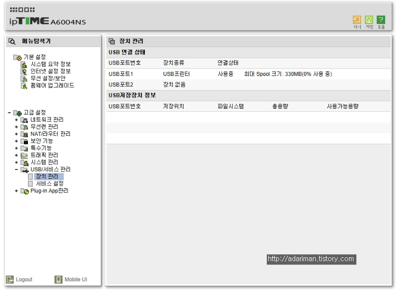 그 후에 192.168.0.1로 접속해서 [USB/서비스 관리] → [장치 관리]로 들어가면 연결한 프린터가 나와 있습니다. 최대 스풀 크기가 330MB이므로 최고 330MB의 문서를 프린터할 수 있습니다.