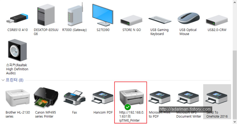[제어판] → [장치 및 프린터]로 들어가면 이렇게 네트워크 프린터가 설치되어 있는 것을 확인하실 수 있습니다. 공유기에 연결된 다른 컴퓨터에서도 같은 방법으로 프린터를 설치해 주고 프린터할때 저 프린터를 선택해서 프린트하면 됩니다.