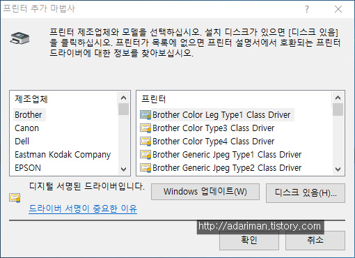 다음은 프린터 드라이버를 설치해야 합니다. 목록에 있다면 그것을 선택하면 되고, 목록에 없다면 [디스크 있음] 버튼을 눌러서 수동으로 드라이버를 설치하면 됩니다. 대다수 프린터 제조업체는 홈페이지에서 프린터 드라이버를 제공하고 있습니다.