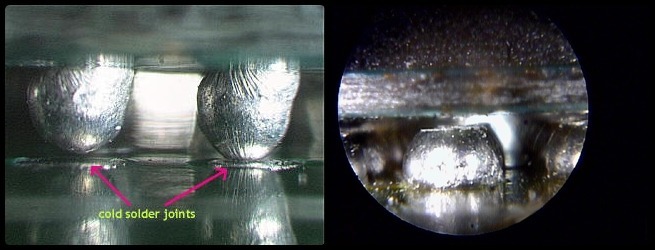 이렇게 붙어있는 납들이 깨지거나 녹으면 위 사진처럼 기판과 칩 사이가 떨어지게 됩니다. 그러면 고장이 발생하는 것입니다.