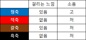 그래서 기계식 키보드의 스위치에는 어떤 종류가 있는지 한번 알아보도록 하겠습니다. 기계식 키보드의 스위치는 '축'이라고도 하며 구동 방식에 따라 크게 청축, 적축, 갈축, 흑축으로 구분할 수 있습니다.