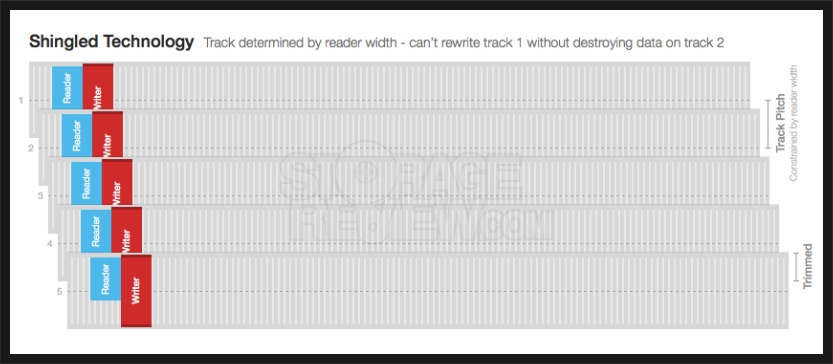 기와식 자기 기록 방식은 말 그대로 겹쳐서 지붕위에 올려놓은 기와처럼 데이터 트랙의 일부를 겹쳐서 저장하는 방식입니다. 겹치는 공간 만큼 더 많은 데이터 저장이 가능하기 때문에 기존의 기록 방식인 CMR에 비해서 쉽게 용량을 높일 수 있습니다.