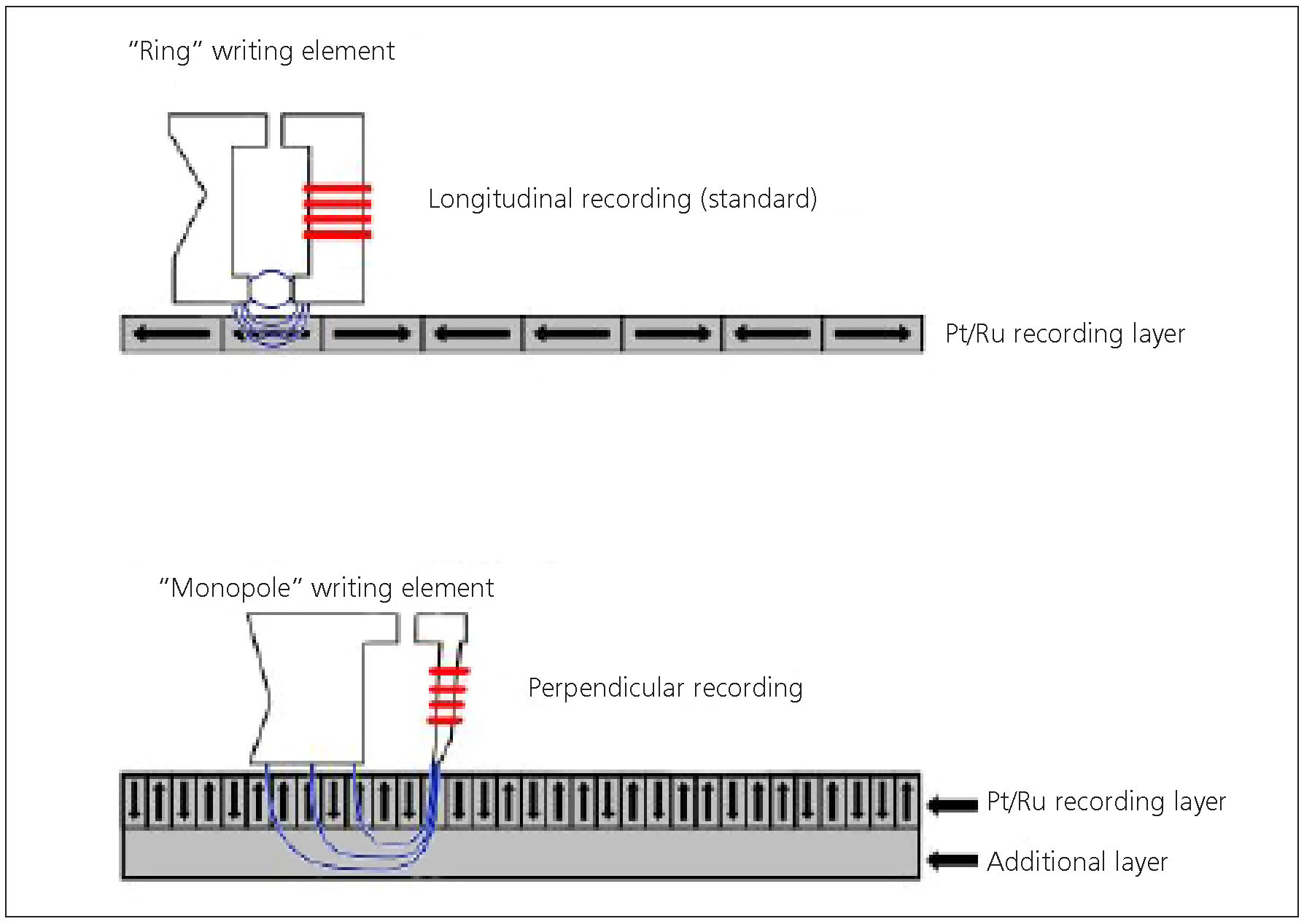 구조가 간단하여 별다른 기술을 요하지 않았기 때문에 과거에는 주류였습니다. 하지만 2003년 도시바가 기록 밀도를 크게 높인 수직 자기 기록방식(PMR)을 개발하면서 점점 시장에서 밀려났으며 현재는 사장되다시피 하여 거의 사용되지 않는 방식입니다.