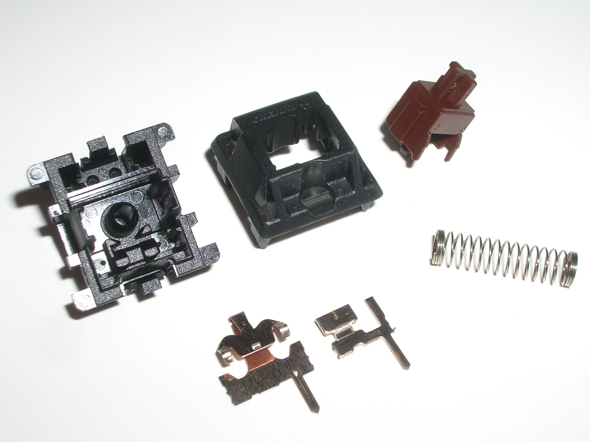 기계식 키보드에서 사용되는 하나의 키는 복잡한 구동부로 되어 있는 스위치 하나로 구성되어 있습니다. 그리고 스위치는 키캡, 키캡받침, 스위치 하우징, 슬라이더, 금속 접촉부, 스프링으로 구분됩니다.