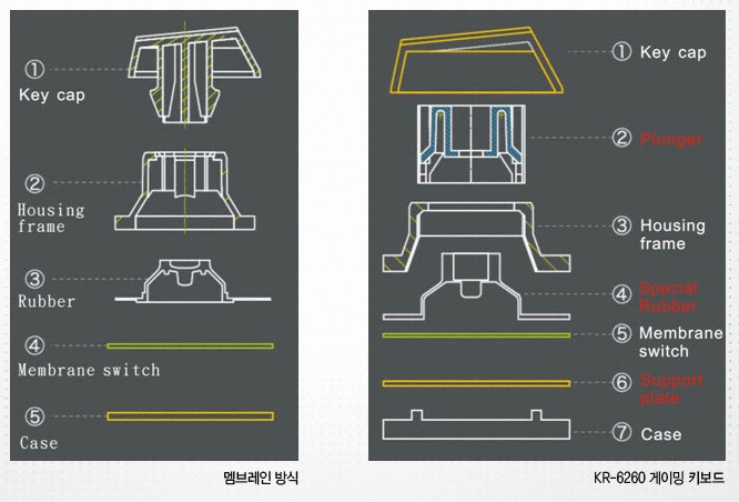 키 입력이 끝나면 러버돔의 반발력으로 키가 다시 올라오지만, 기계식 키보드의 스프링보다는 반발력이 적기 때문에 키압은 기계식 키보드보다 낮으며 소음이 적습니다.