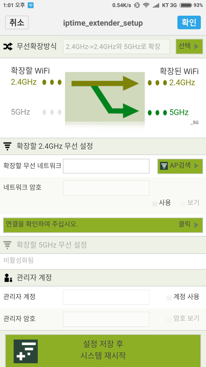 설정 화면입니다. 최초로 무선 확장기를 연결하면 iptime_extender_setup 라는 SSID가 나오는데 그 쪽으로 연결하게 되면 이런 설정 창이 먼저 나옵니다. 여기서 관리자 계정을 설정하고 확장 방식을 선택한 뒤 AP를 검색하고 어디에 연결할 것인지 선택할 수 있습니다. 오른쪽 상단 관리 도구를 누르면 기존 아이피타임 공유기처럼 상세한 설정이 가능합니다.