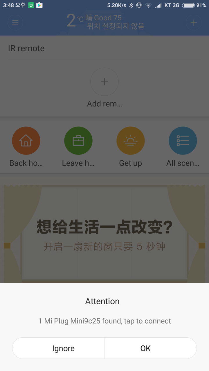 일단 블루투스를 켜 놓고 어플리케이션을 실행시키면 이렇게 주변에 있는 샤오미 스마트 기기가 자동으로 뜹니다. 그런데 자동으로 뜨지 않으면 오른쪽 위에 + 버튼을 눌러서 Mi Plug Mini를 찾아서 수동으로 추가하면 됩니다.