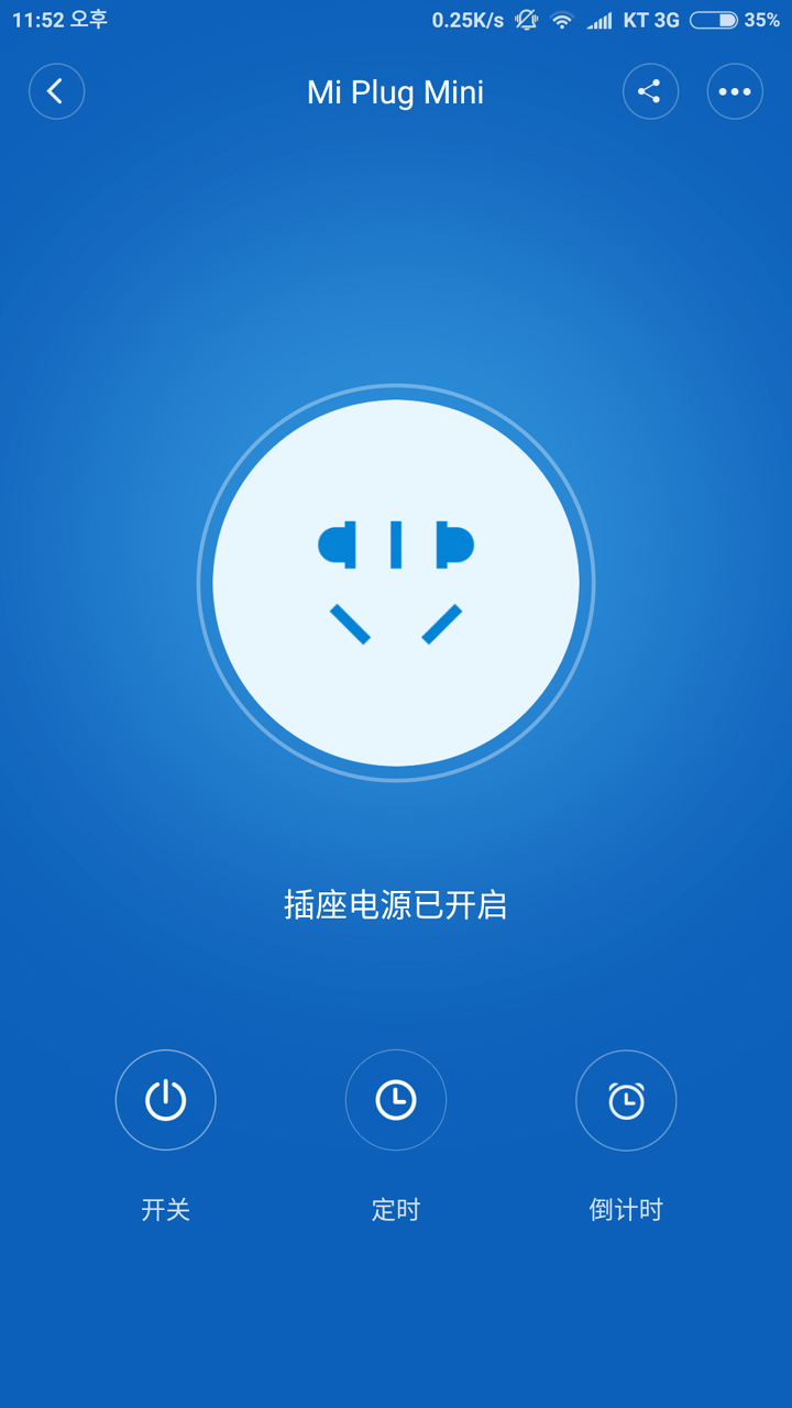 이제 가운데 큰 소켓모양을 누르면 켜지고 꺼집니다. 아래 버튼은 왼쪽부터 on/off, 타이머, 카운트다운 버튼입니다. 타이머는 시간맞춰 자동으로 켜고 끄기가 가능하고 카운트다운은 정한 시간 후에 자동으로 꺼지는 기능입니다.