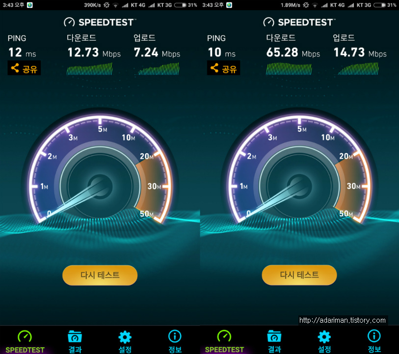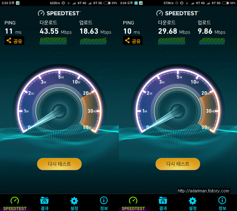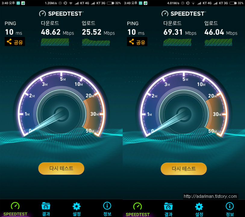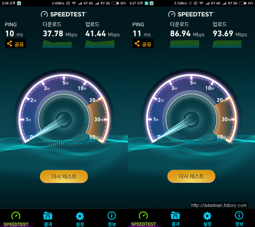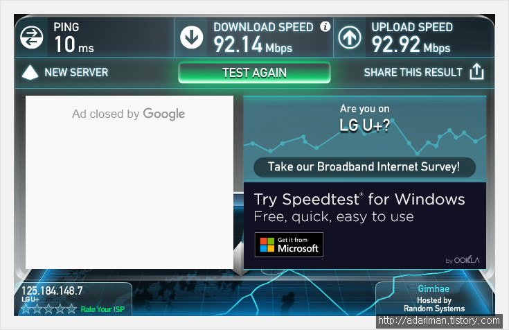 유선 성능은 100m 광랜을 사용하고 있기 때문에 다운로드 92.14, 업로드 92.92로 스펙에 근접하게 나오고 있습니다.