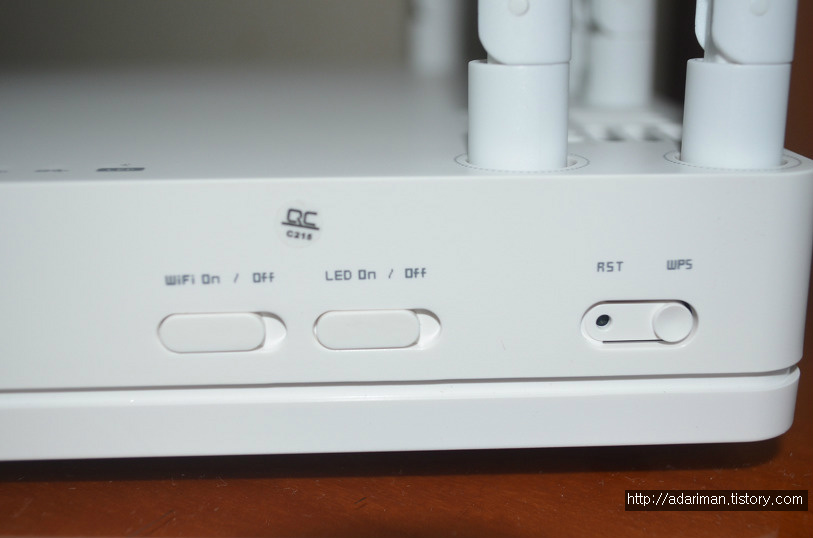 아래쪽 측면에는 와이파이와 LED를 켜고 끌 수 있는 스위치와 무선 기기를 쉽게 연결할 수 있는 WPS 버튼, 리셋 버튼이 존재하고 있습니다.