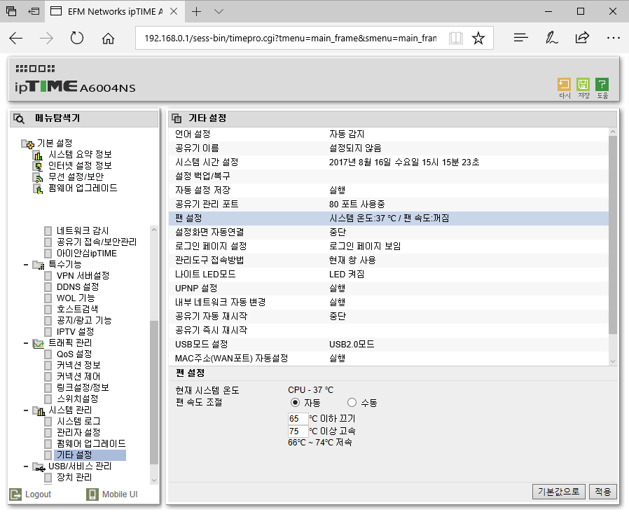 관리 페이지에서 현재 상태를 살펴볼 수 있으며 무선, 유선, IPTV, DDNS, 펌웨어 등 각종 설정이 가능하고 위에 나와 있듯이 쿨링팬의 동작과 관련한 설정도 가능합니다.