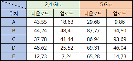 유선 성능 측정은 유선으로 연결된 컴퓨터 한 대에서, 무선 성능 측정은 일반적인 32평형의 아파트에서 5군데의 위치를 지정하여 속도를 측정하는 방식으로 진행하였습니다.
