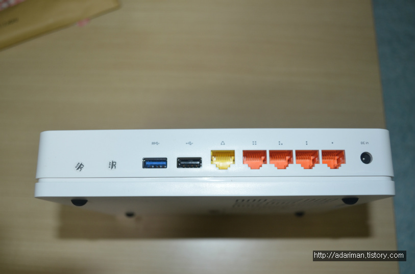 USB 3.0 포트 1개, USB 2.0 포트 1개, WAN 1개, LAN 포트 4개가 있으며 DC 전원 입력포트가 있습니다.