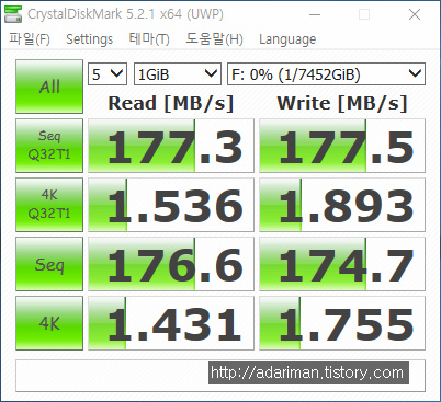 성능은 읽기 속도가 176 MB/s, 쓰기 속도가 174 MB/s 로 제조사가 제시하는 스펙(178 MB/s)에 근접하고 있습니다.