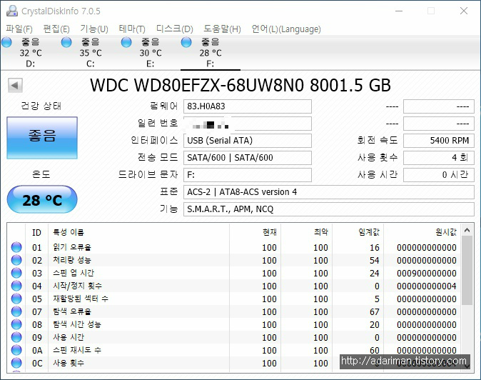 연결한 다음 크리스탈디스크인포를 켜면 WD80EFZX, 5,400rpm임을 다시 한번 확인할 수 있습니다.