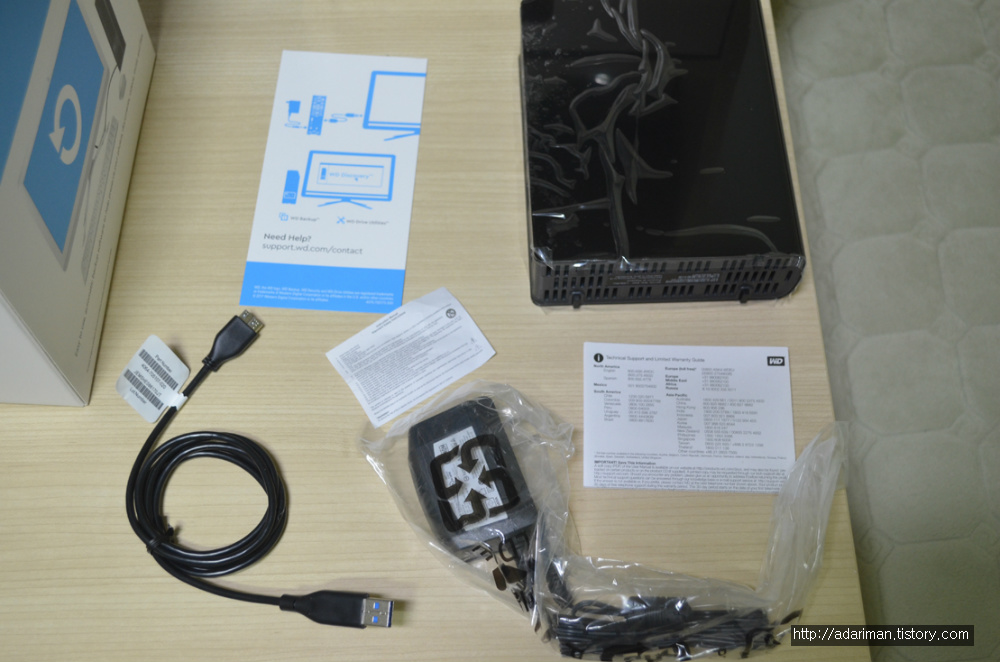 위에서도 봤지만 구성품은 본체, 설치 가이드, AC 어댑터, USB 3.0 케이블이 들어있습니다.
