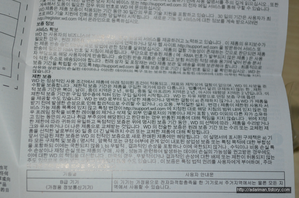 설명서는 한국어로도 나와 있습니다. 하지만 한국에서는 수리를 받을 수 없습니다. RMA를 신청한 뒤에 베트남에 소재한 WD 본사로 보내야 합니다.