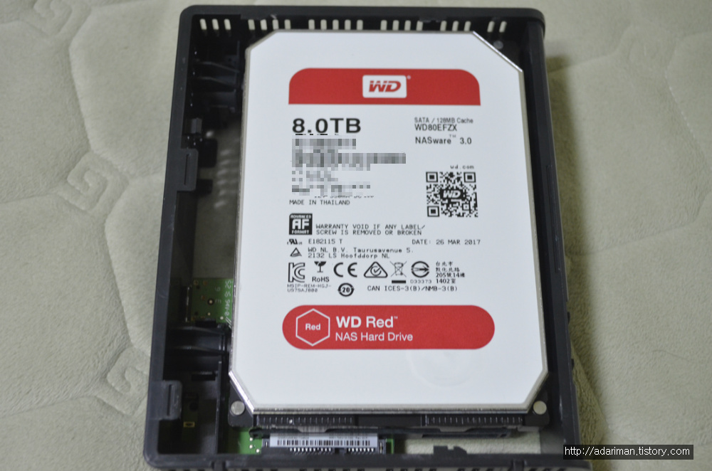케이스를 열면 이렇게 NAS용 레드 하드디스크가 들어있습니다. WD80EFZX라고 위에 써져 있고 5,400rpm, 128MB 캐시가 내장되어 있는 하드디스크입니다.