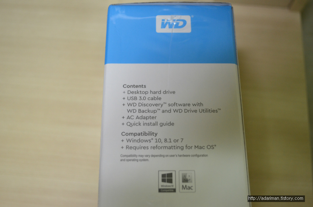 측면에는 이렇게 들어있는 구성물과 지원되는 사항을 알려주고 있습니다. 본체, USB 3.0 케이블, WD 디스커버리, 드라이브 유틸리티, AC 어댑터, 빠른 설치 가이드가 들어 있다고 나와 있고 윈도우 7, 8.1, 10, 맥OS에서 사용할 수 있다고 나와 있습니다.