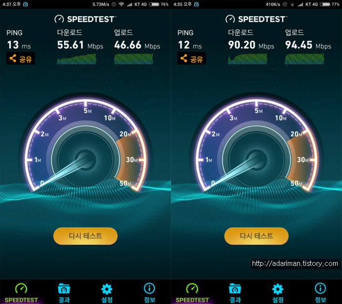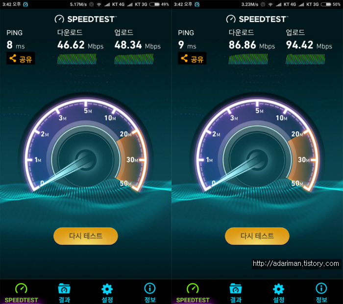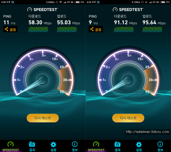 무선 성능을 여러 장소에서 측정하여 성능을 알아보겠습니다. 인터넷은 100Mbps 광랜을 사용중입니다.