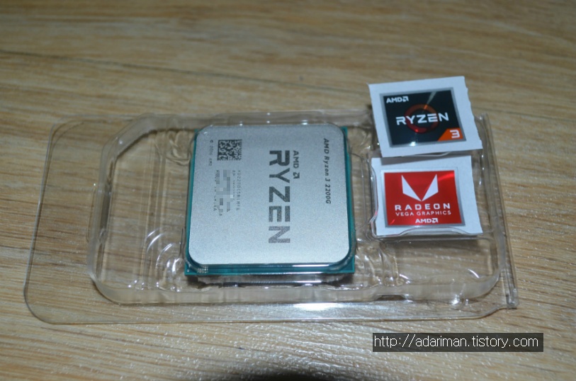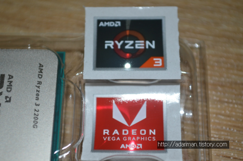 CPU와 스티커가 들어있습니다. 스티커는 두 개가 들어있습니다. 라이젠 스티커와 라데온 스티커가 각각 들어있습니다.