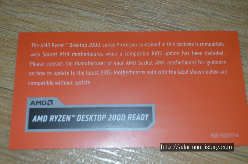 CPU가 들어있는 작은 박스 안에는 CPU 말고도 안내문이 들어 있습니다. 라이젠 데스크톱 2000 시리즈는 최신 바이오스가 설치된 AM4 메인보드에서 사용이 가능하다고 나와 있습니다.
