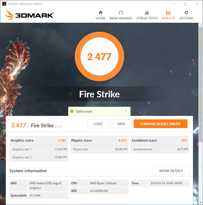 게이밍 성능을 측정하기 위해 3DMark Fire Strike를 실행시켰습니다. 그래픽 스코어는 2,761점으로 인텔의 HD 630과 비교해서는 약 2.5배 정도 더 높습니다.