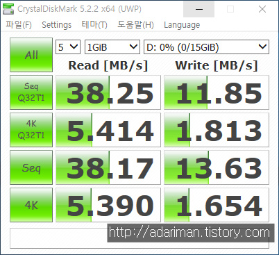 스펙상 읽기 쓰기 속도가 표시되어 있지 않아서 어느정도인지 모르겠는데 프로그램으로 확인을 하니 읽기 38MB/s, 쓰기 13MB/s 정도가 나옵니다.