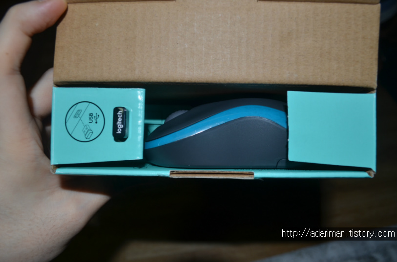USB 수신기는 박스 한쪽에 걸쳐져 있습니다. 아래에서 보시면 아시겠만 마우스에도 USB 수신기를 수납할 수 있는 공간이 있습니다.