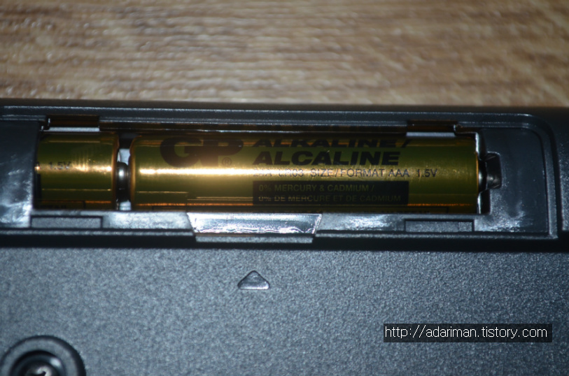 AA 규격의 건전지가 하나 들어갑니다. 기본적으로 건전지가 하나 포함되어 있습니다. 오른쪽 노란색 스티커 비슷한 것을 제거하고 사용하면 됩니다. 그리고 건전지 아래에 USB 수신기를 수납할 수 있는 공간이 있습니다.