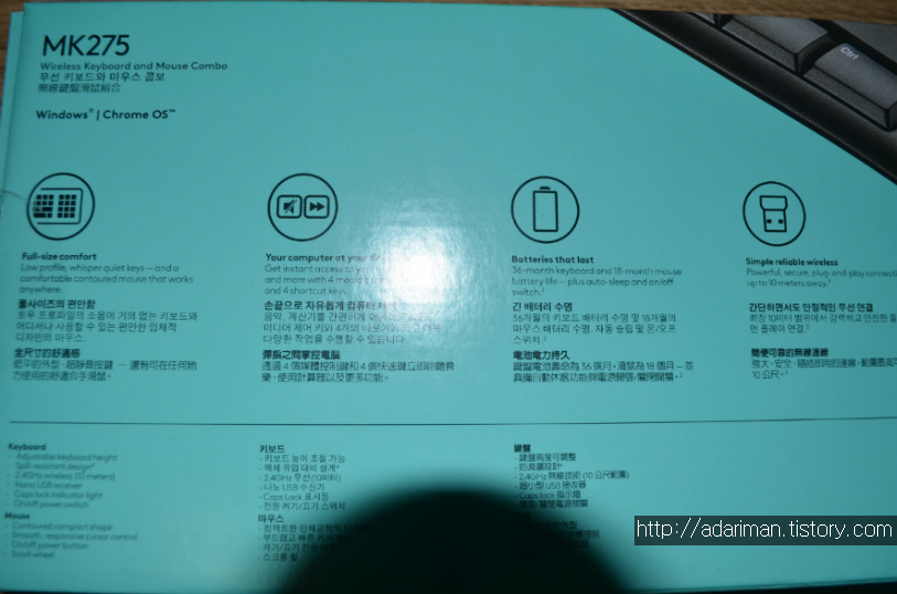 박스 뒷면에는 각종 스펙 사양들이 나와있습니다. 건전지로 동작하는데, 한 번 건전지를 넣으면 키보드는 36개월, 마우스는 18개월 사용 가능하다고 나와 있습니다. 물론 개인의 사용 패턴에 따라 달라질 수 있겠습니다.
