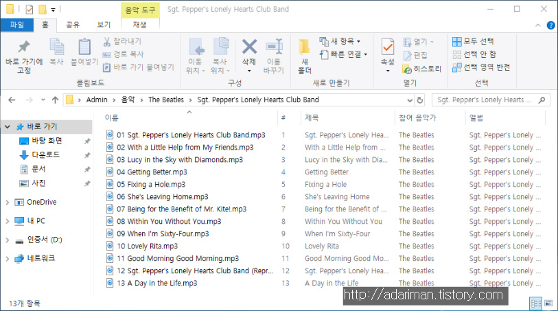 CD에 들어있는 음악들이 모두 나옵니다. 보통은 앨범 이미지를 포함해서 모든 MP3 태그 정보들이 미리 입력되어 있습니다만 만약에 없다면 나중에 모두 수동으로 입력해줘야 합니다.