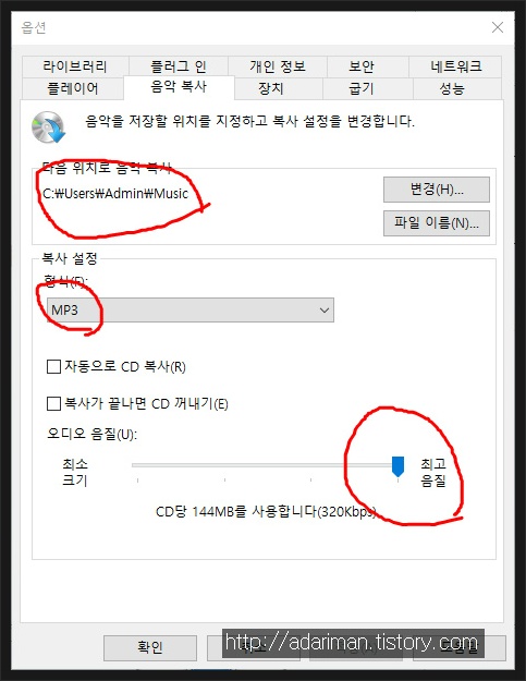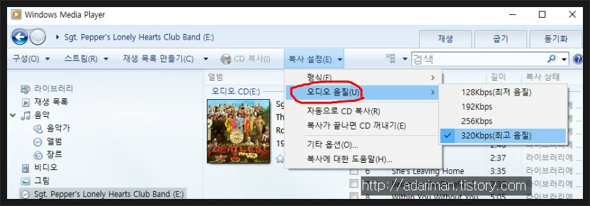 다시 [오디오 음질]에서 오디오 음질을 정해줍니다 320Kbps가 최고, 128Kbps가 최저입니다. 개인적으로는 320Kbps를 선호합니다만 192Kbps 이상은 잘 구분이 되지 않습니다.