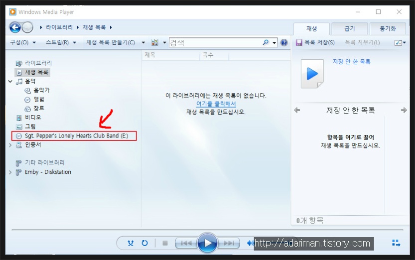 미디어 플레이어가 실행되면 왼쪽에 넣은 CD가 나오니까 선택하면 됩니다.