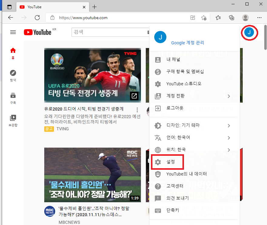 ① 유튜브 메인화면에서 구글 아이디로 로그인하신 뒤에 오른쪽 위 개인정보 버튼을 누른 다음 설정에 들어갑니다.