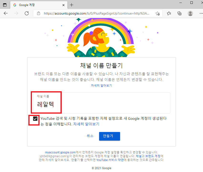 ④ 채널 이름을 넣고 아래 박스에 체크한 다음 만들기 버튼을 누릅니다.