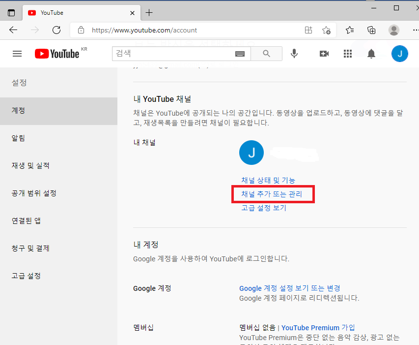 ② '채널 추가 또는 관리' 를 누릅니다.
