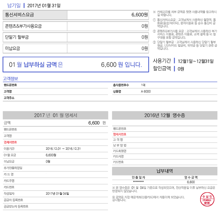 상단은 이번달 제 통신요금 명세서인데 A6000요금제에 6,600원을 내고 있는 것을 확인하실 수 있습니다. 그러면 2년 동안 사용한다고 가정하고 계산을 해보겠습니다.