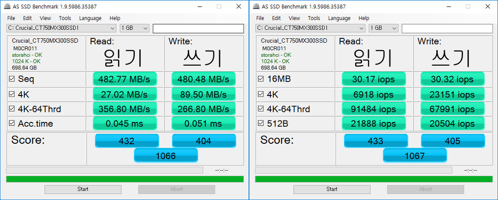 AS SSD 벤치마크입니다. 순차 읽기, 순차 쓰기 속도가 각각 482.77 MB/s, 480.48MB/s로 약간 스펙에 미치지 못하지만 미치지 못하고 있습니다만 준수한 속도를 내 줍니다.