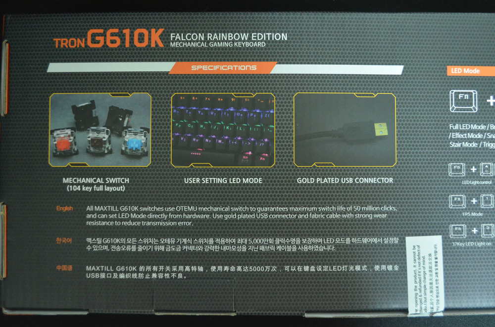 TRON G610K FALCON RAINbOW EDITION 기계식 게이밍 키보드라고 되어 있습니다. 제조국은 중국입니다.