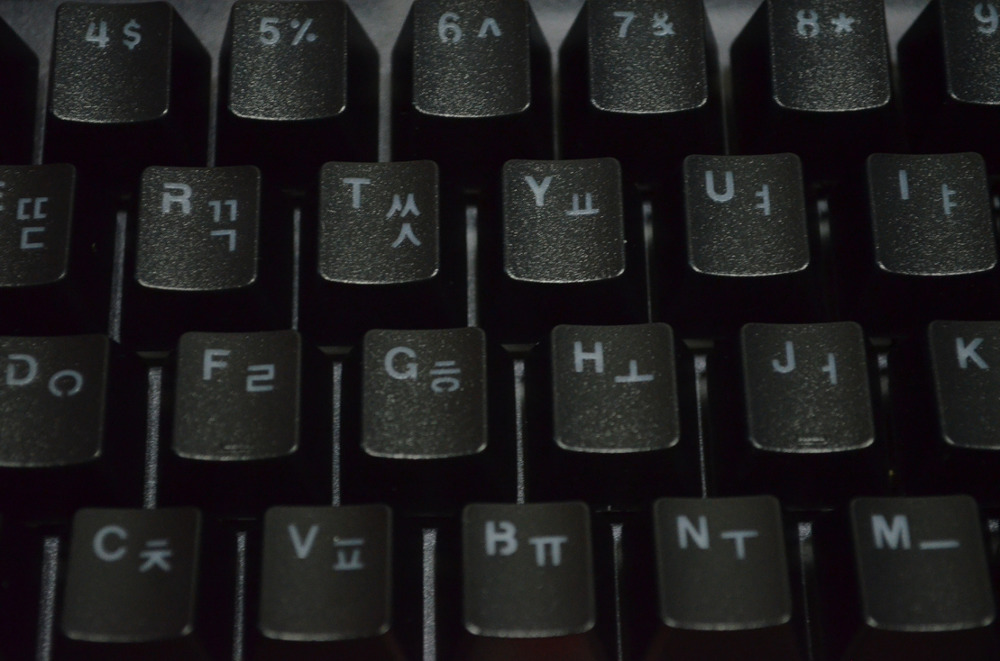 자세히 보시면 한/영 이중사출 키캡인 것을 아실 수 있습니다. 최근에 몇몇 키보드들은 이중사출이라고 해놓고 영어만 이중사출이고 한글은 그냥 흰색으로 프린팅되어 있는 경우가 많은데 이건 한글까지 이중사출 처리되어 있습니다.