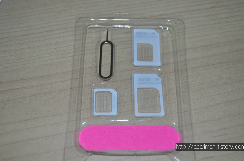 유심카드 어댑터 3종과 유심 트레이를 뽑아주는 핀, 그리고 사포가 들어있습니다.