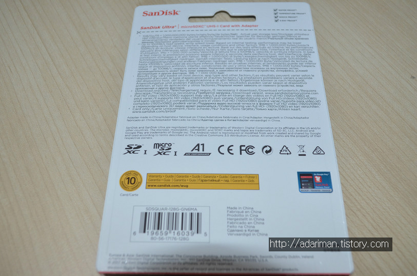 뒷면입니다. 뒷면에는 많은 내용들이 설명되어 있는데, 죄다 영어를 포함한 외국 언어로 되어 있어 번역할 수가 없습니다. 그냥 좋다는 내용이겠죠. 10년이라는 긴 보증기간에서 품질에 대한 자신감을 엿볼 수 있습니다... 라기 보다는 사실 최근 출시되는 마이크로 SD 카드는 거의 모든 회사가 10년 정도는 기본적으로 보증합니다.