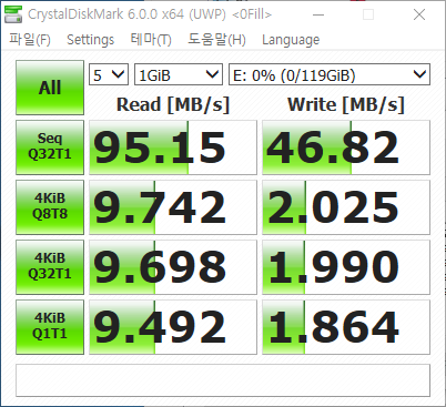 쓰기 속도는 이정도 나옵니다. 읽기 95.15MB/s, 쓰기 46.82MB/s 정도면 되게 잘 나온것 같습니다. 다만 초고해상도 사진을 연사로 찍을 용도로는 쓰기 속도가 느려서 좀 무리가 있겠네요.